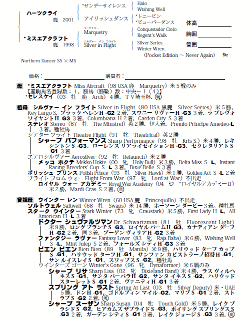 父ハーツクライ 母ミスエアクラフト(母父Marquetry)