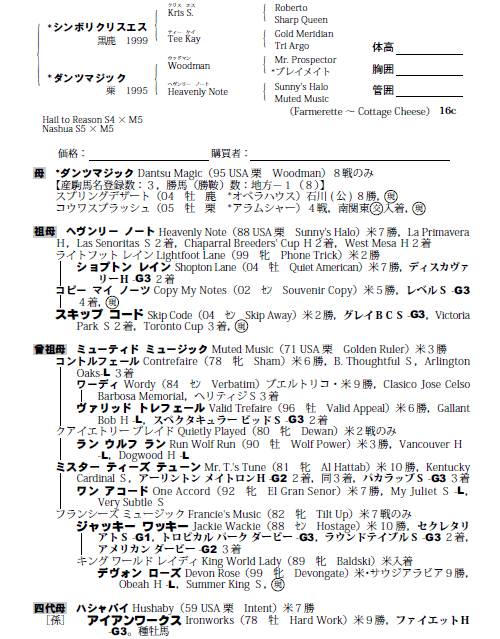 父シンボリクリスエス 母ダンツマジック(母父Woodman)