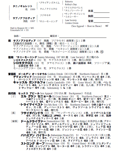 父タニノギムレット 母サブノアフロディア(母父フジキセキ)