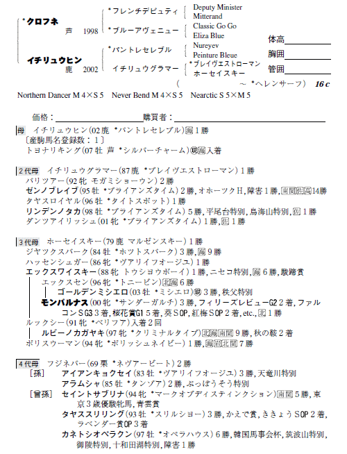 父クロフネ 母イチリュウヒン(母父パントレセレブル )