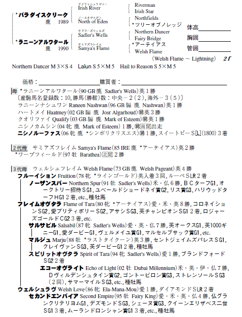 父パラダイスクリーク 母ラニーンアルワタール(母父Sadler's Wells)