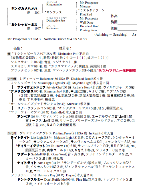 父キングカメハメハ 母ミシシッピーミス(母父Distinctive Pro)