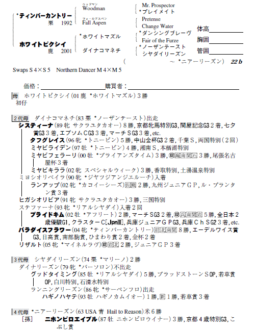 父ティンバーカントリー 母ホワイトピクシイ(母父ホワイトマズル)