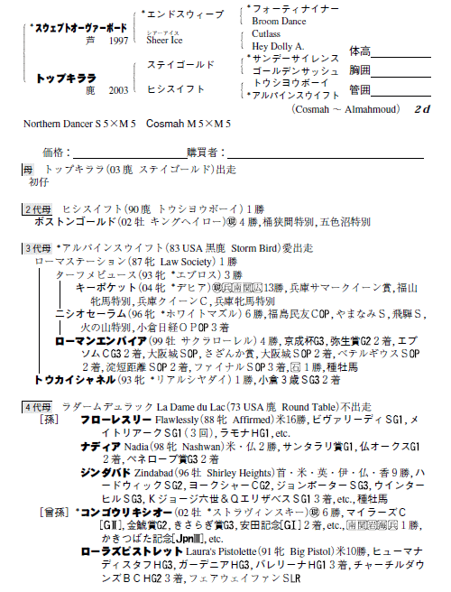 父スウェプトオーヴァーボード 母トップキララ(母父ステイゴールド)