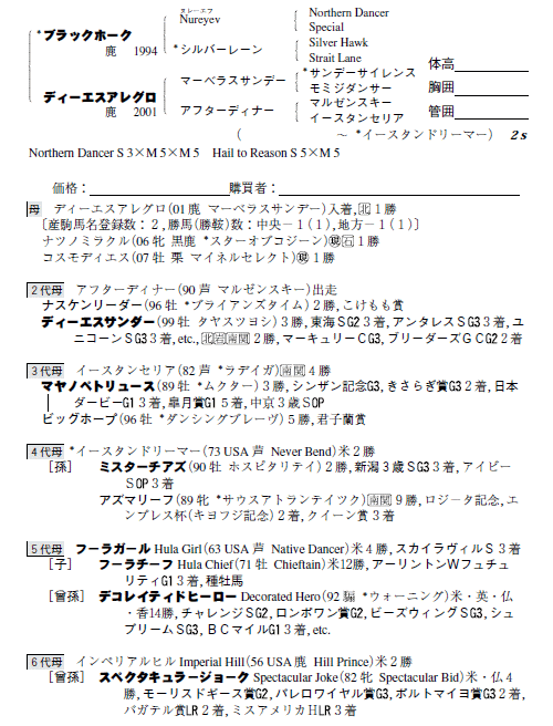 | 父ブラックホーク 母ディーエスアレグロ(母父マーベラスサンデー) |