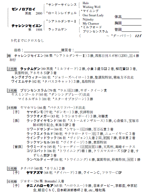 父ゼンノロブロイ 母チャレンジセイエン(母父シアトルダンサーII)