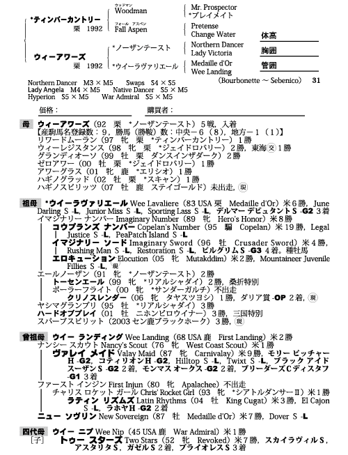 父ティンバーカントリー 母ウィーアワーズ(母父ノーザンテースト)