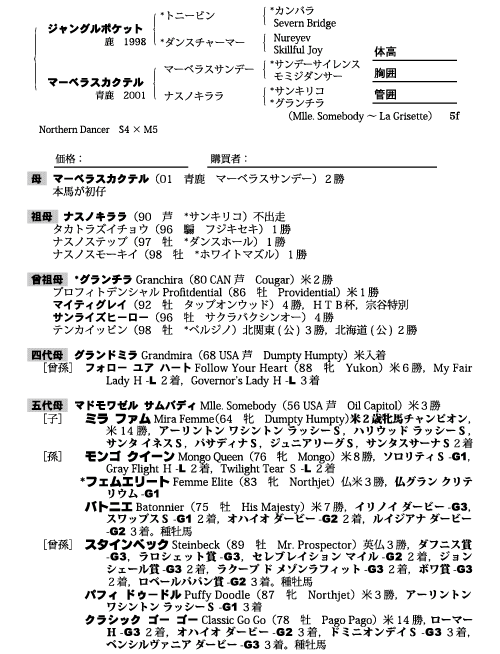 父ジャングルポケット 母マーベラスカクテル(母父マーベラスサンデー)