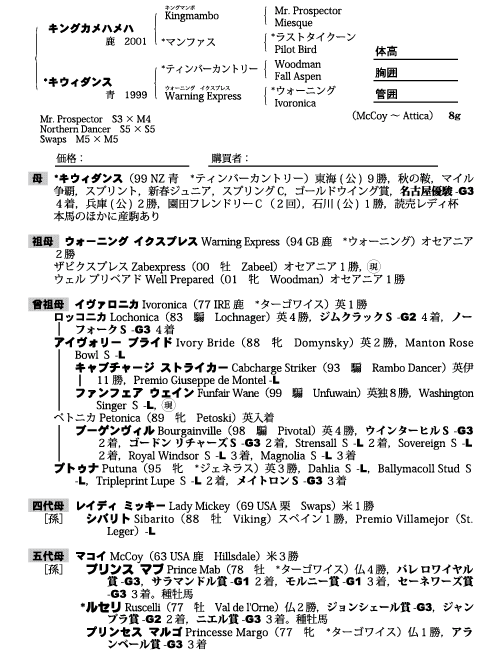 父キングカメハメハ 母キウィダンス(母父ティンバーカントリー)