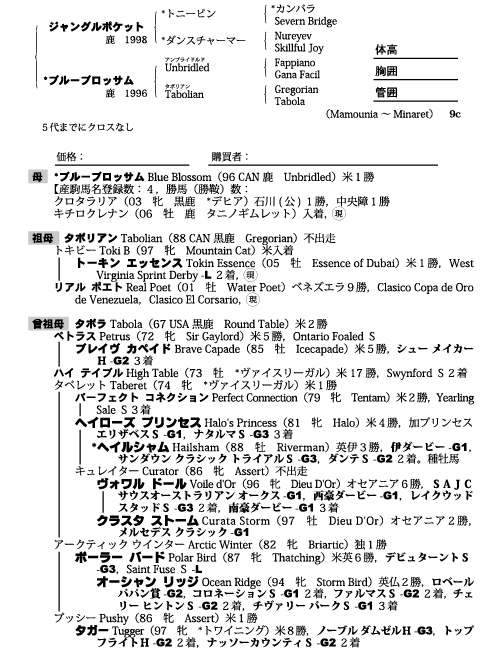 父ジャングルポケット 母ブルーブロッサム(母父Unbridled)