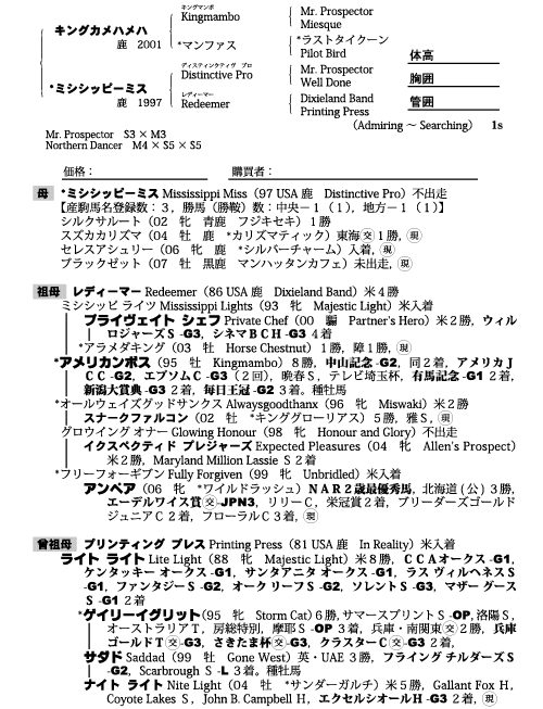 父キングカメハメハ 母ミシシッピーミス(母父Distinctive Pro)