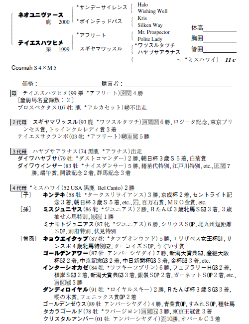 | 父ネオユニヴァース 母テイエスハツヒメ(母父アフリート) |