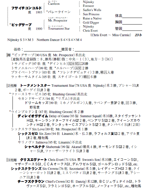 父フサイチコンコルド 母ビッグサーブ(母父Mr.Prospector)