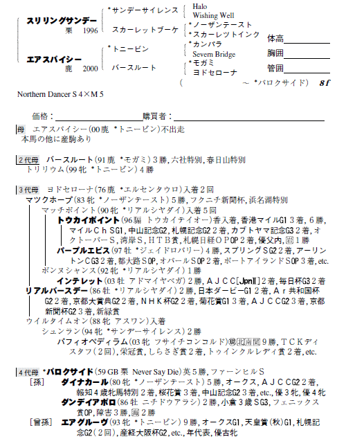 父スリリングサンデー 母エアスパイシー(母父トニービン)