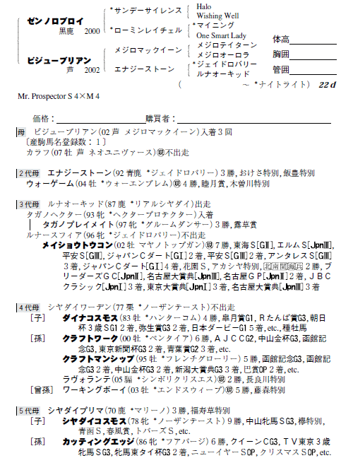 父ゼンノロブロイ 母ビジューブリアン(母父メジロマックイーン)