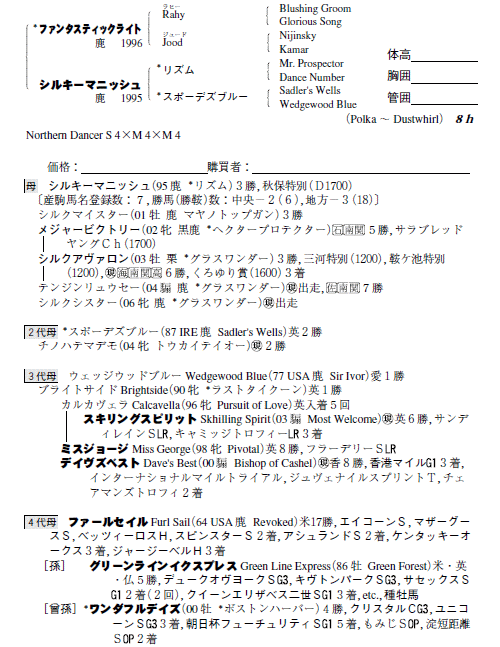 父ファンタスティックライト 母シルキーマニッシュ(母父リズム)