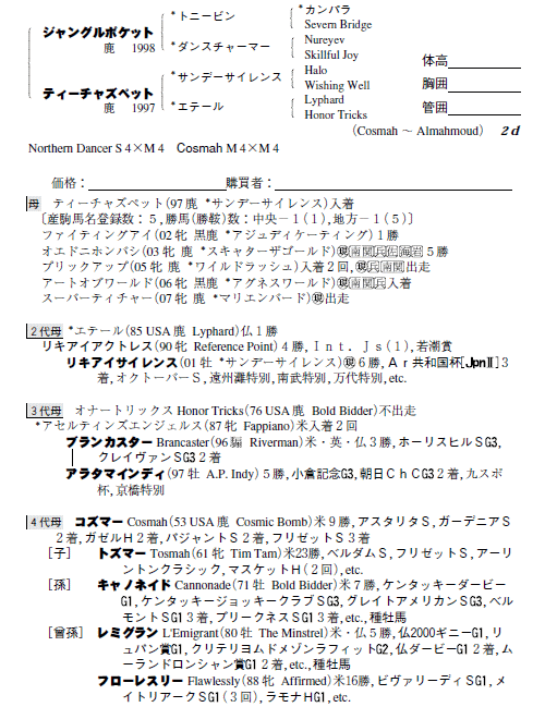 父ジャングルポケット 母ティーチャズペット(母父サンデーサイレンス)