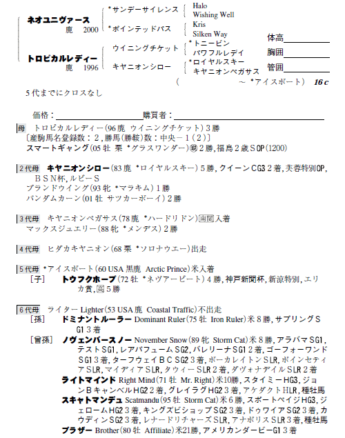 父ネオユニヴァース 母トロピカルレディー(母父ウイニングチケット)