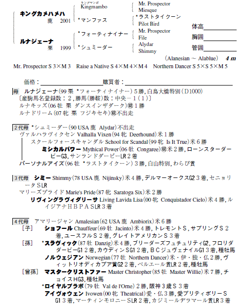 | 父キングカメハメハ 母ルナジェーナ(母父フォーティナイナー) |