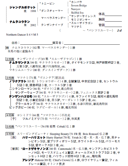 父ジャングルポケット 母ナムラコウラン(母父マーベラスサンデー)