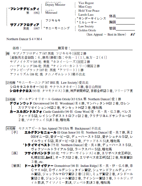 | 父フレンチデピュティ 母サブノアフロディア(母父フジキセキ) |