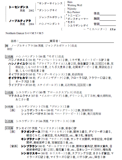 | 父トーセンダンス 母ノーブルティアラ(母父ジャングルポケット) |
