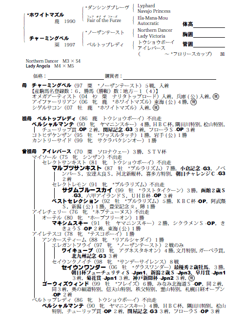 父ホワイトマズル 母チャーミングベル(母父Gentlemen)