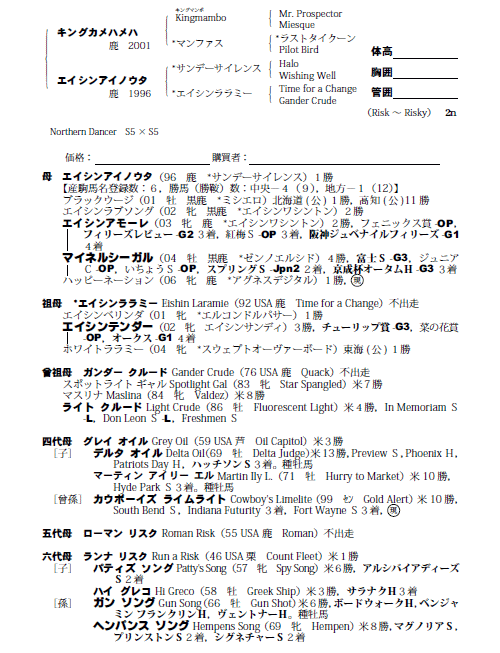| 父キングカメハメハ 母エイシンアイノウタ(母父サンデーサイレンス) |