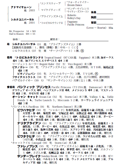| 父アドマイヤムーン 母シルクユニバーサル(母父ブライアンズタイム) |