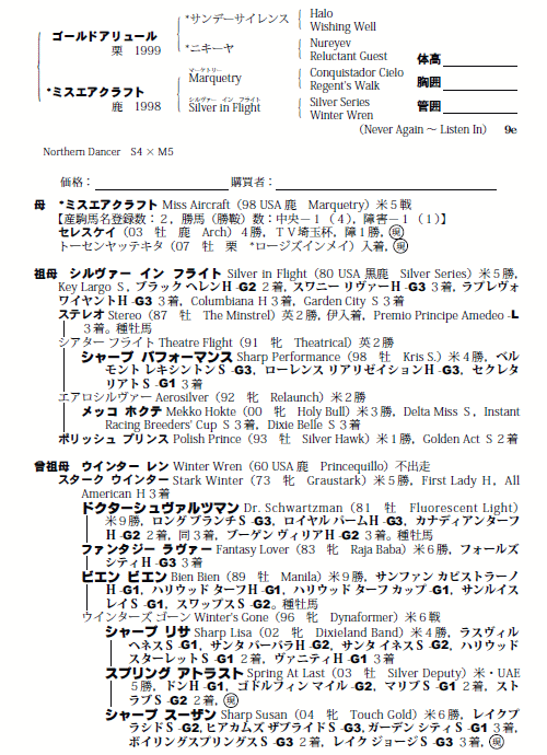 | 父ゴールドアリュール 母ミスエアクラフト(母父Marquetry) |