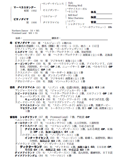 | 父マーベラスサンデー 母ピサノダイヤ(母父ミルジヨージ) |