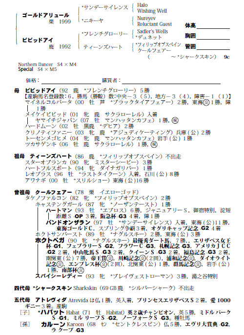 | 父ゴールドアリュール 母ビビッドアイ(母父フレンチグローリー) |