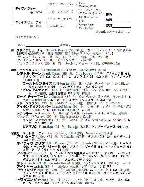 | 父ダイワメジャー 母フサイチビューティー(母父フォーティナイナー) |
