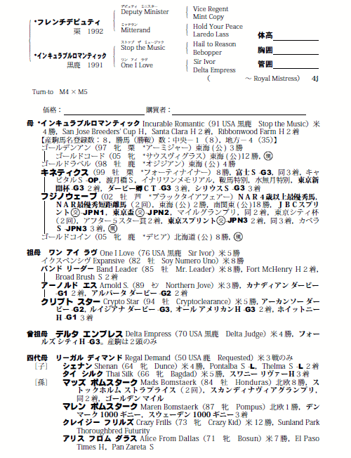 | 父フレンチデピュティ 母インキュラブルロマンティック(母父Stop the Music) |