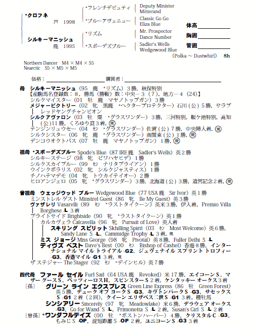 父クロフネ 母シルキーマニッシュ(母父リズム)