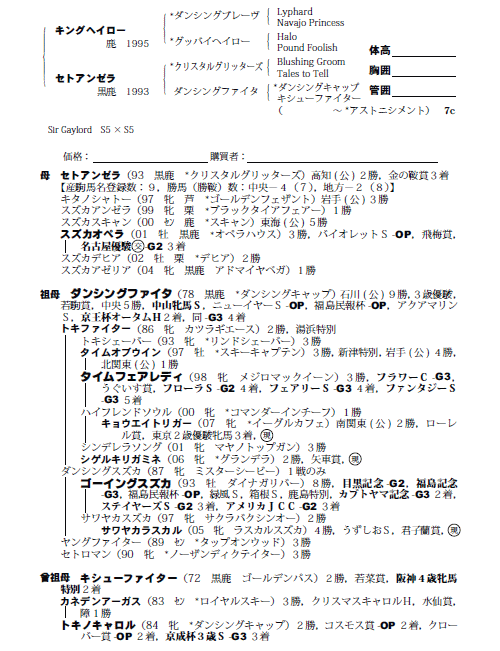 | 父キングヘイロー 母セトアンゼラ(母父クリスタルグリツターズ) |