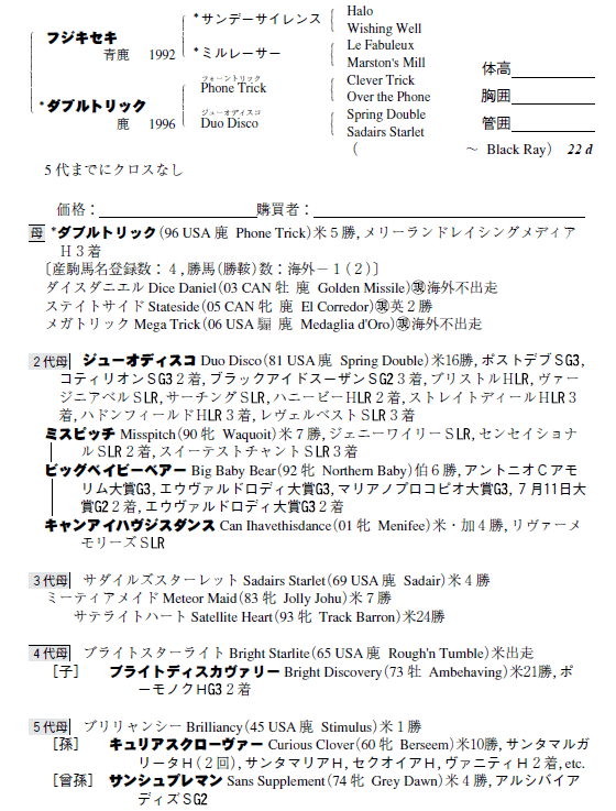 父:フジキセキ 母:ダブルトリック(母父:Phone Trick)