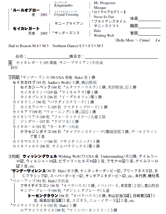 父:ルールオブロー 母:セイカレガート(母父:サニーブライアン)