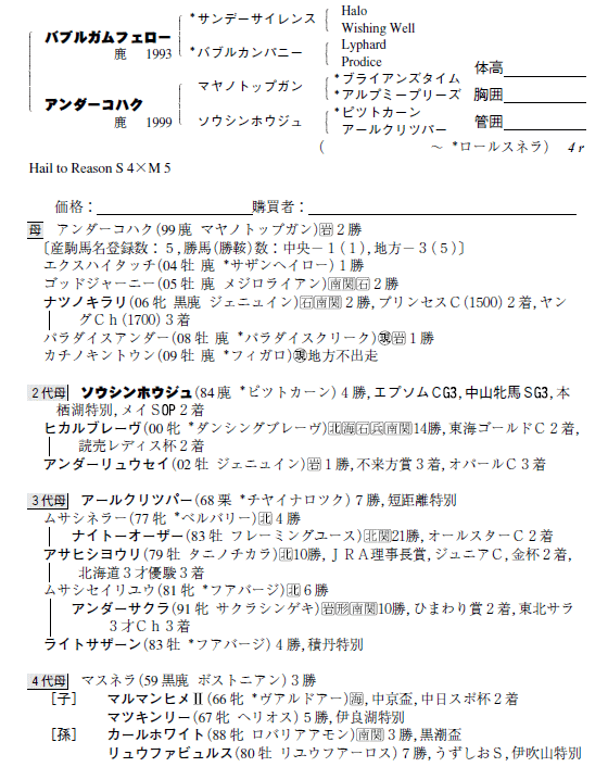 父:バブルガムフェロー 母:アンダーコハク(母父:マヤノトップガン)