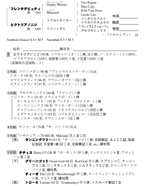 父:フレンチデピュティ 母:ビクトリアノニジ(母父:トウカイテイオー)