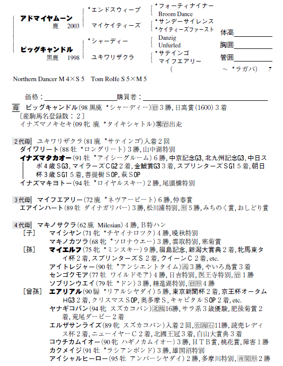 父:アドマイヤムーン 母:ビッグキャンドル(母父:シャーディー)