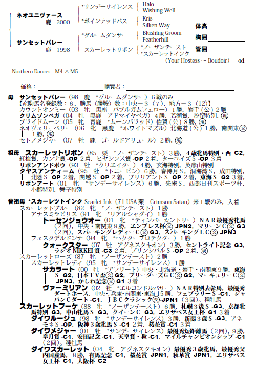 | 父:ネオユニヴァース 母:サンセットバレー(母父:グルームダンサー) |