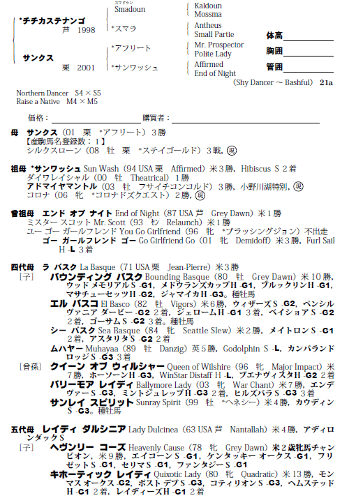 | 父:チチカステナンゴ 母:サンクス(母父:アフリート) |