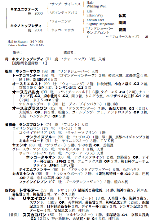父:ネオユニヴァース 母:キクノトップレディ(母父:ウォーニング)