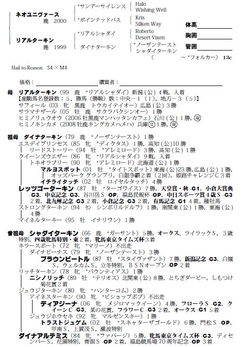父:ネオユニヴァース 母:リアルターキン(母父:リアルシヤダイ)
