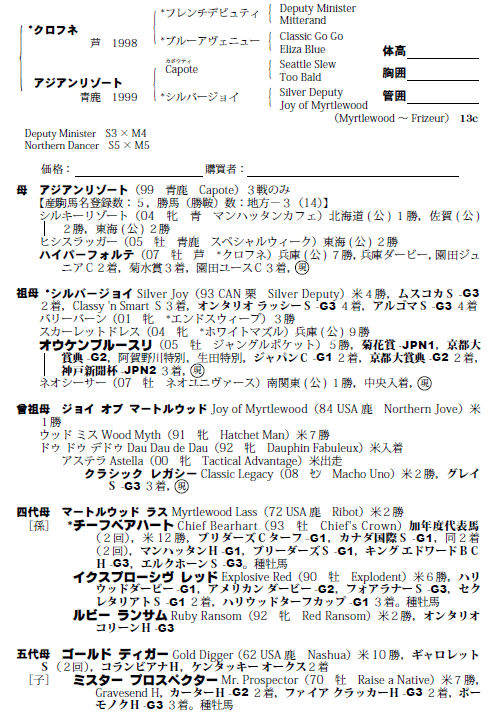 | 父:クロフネ 母:アジアンリゾート (母父:Capote) |