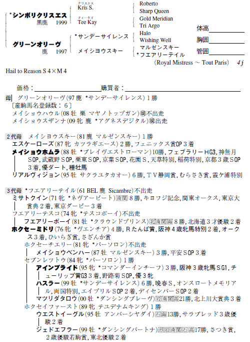 父:シンボリクリスエス 母:グリーンオリーヴ(母父:サンデーサイレンス )