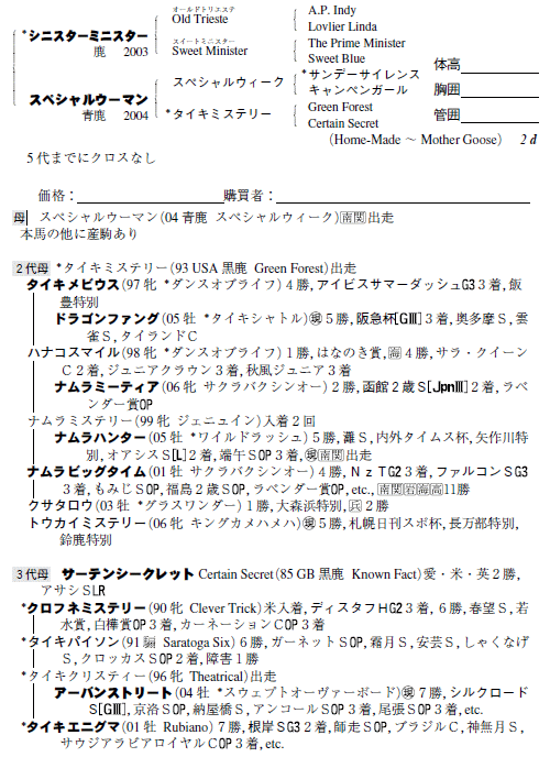 父:シニスターミニスター 母:スペシャルウーマン (母父:スペシャルウィーク)