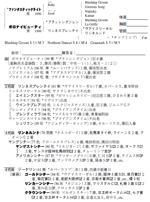父:ファンタスティックライト 母:ボロナイビューティ(母父:ブラッシングジョン)