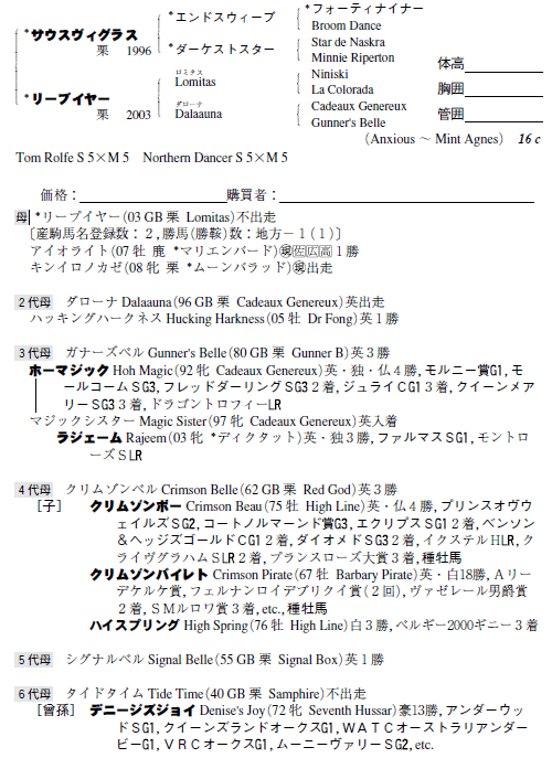 父:サウスヴィグラス 母:リープイヤー(母父:Lomitas)